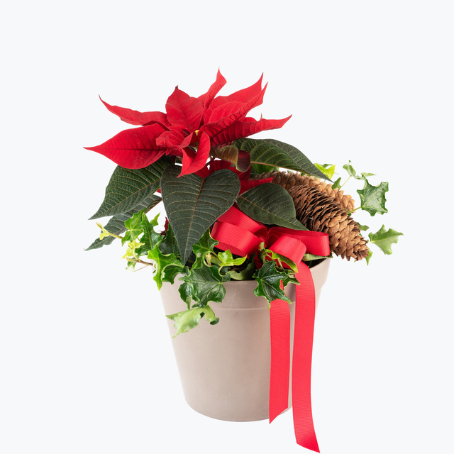 Sammenplantning med klassikerne rød julestjerne og grønn eføy, kongler og sløyfe. Et godt valg om du ønsker å sende en tradisjonell hilsen med de beste ønsker for julen og det nye året .